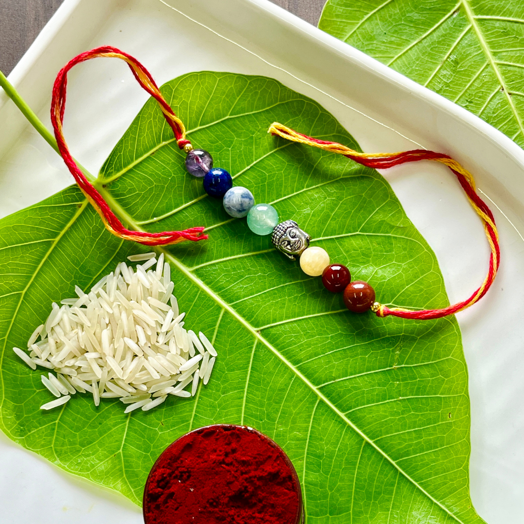 This Raksha Bandhan, gift your brother not just a thread of love, but a sacred circle of healing and spiritual energy. The 7 Chakra Rakhi with Buddha Charm is a handcrafted blend of powerful crystals and divine symbolism—meant to balance energy, offer inner peace, and protect his journey ahead.