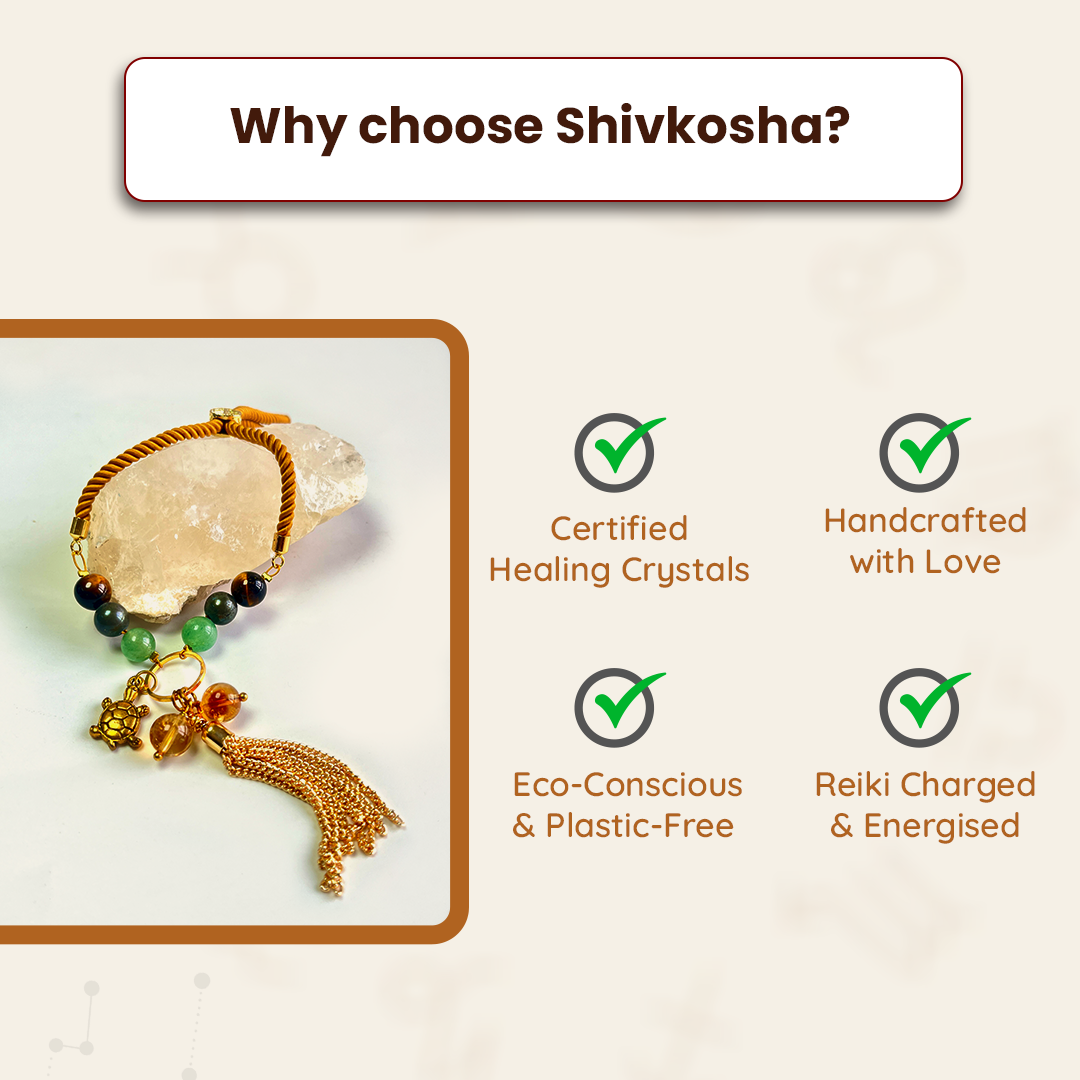 Celebrate the divine bond of Raksha Bandhan with a spiritual twist! The Money Magnet Bracelet Lumba is a powerful blend of Citrine, Tiger Eye, Green Aventurine, and Pyrite each known as a money-attracting crystal. Crafted with four powerful prosperity crystals—Citrine, Tiger Eye, Green Aventurine, and Pyrite, this elegant bracelet is designed especially for your beloved bhabhi. Each stone is known to attract wealth, boost luck, and protect from negativity, making this more than just a Rakhi—it’s a divine blessing. Gift her positive energy, spiritual strength, and stylish elegance in one sacred thread. This Lumba is specially designed for sisters-in-law (bhabhi), offering not only protection and blessings but also abundance, prosperity, and confidence.