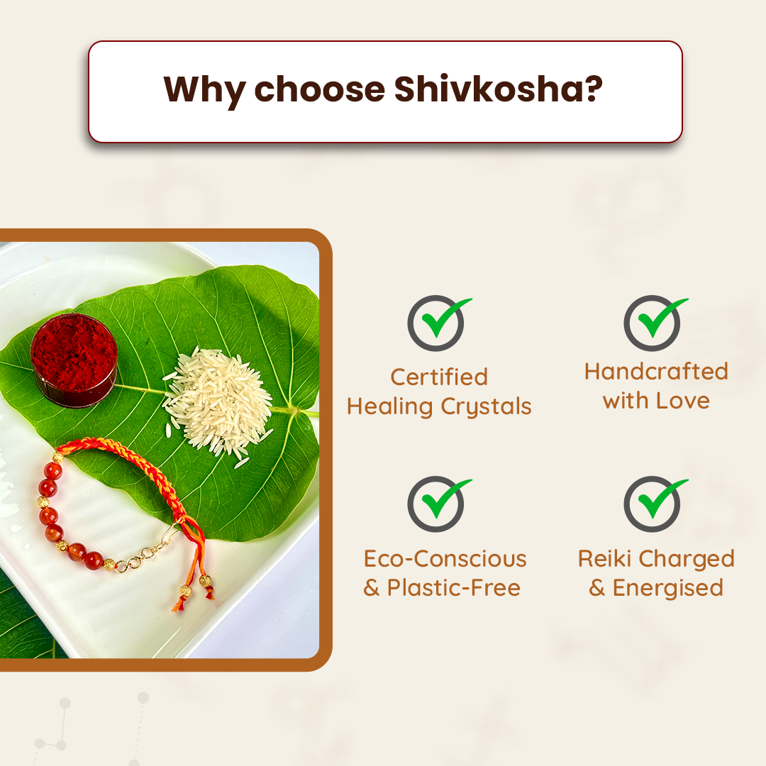 Tie a thread that aligns his energy, protects his spirit & creativity with Our Red Carnelian Bracelet Rakhi.