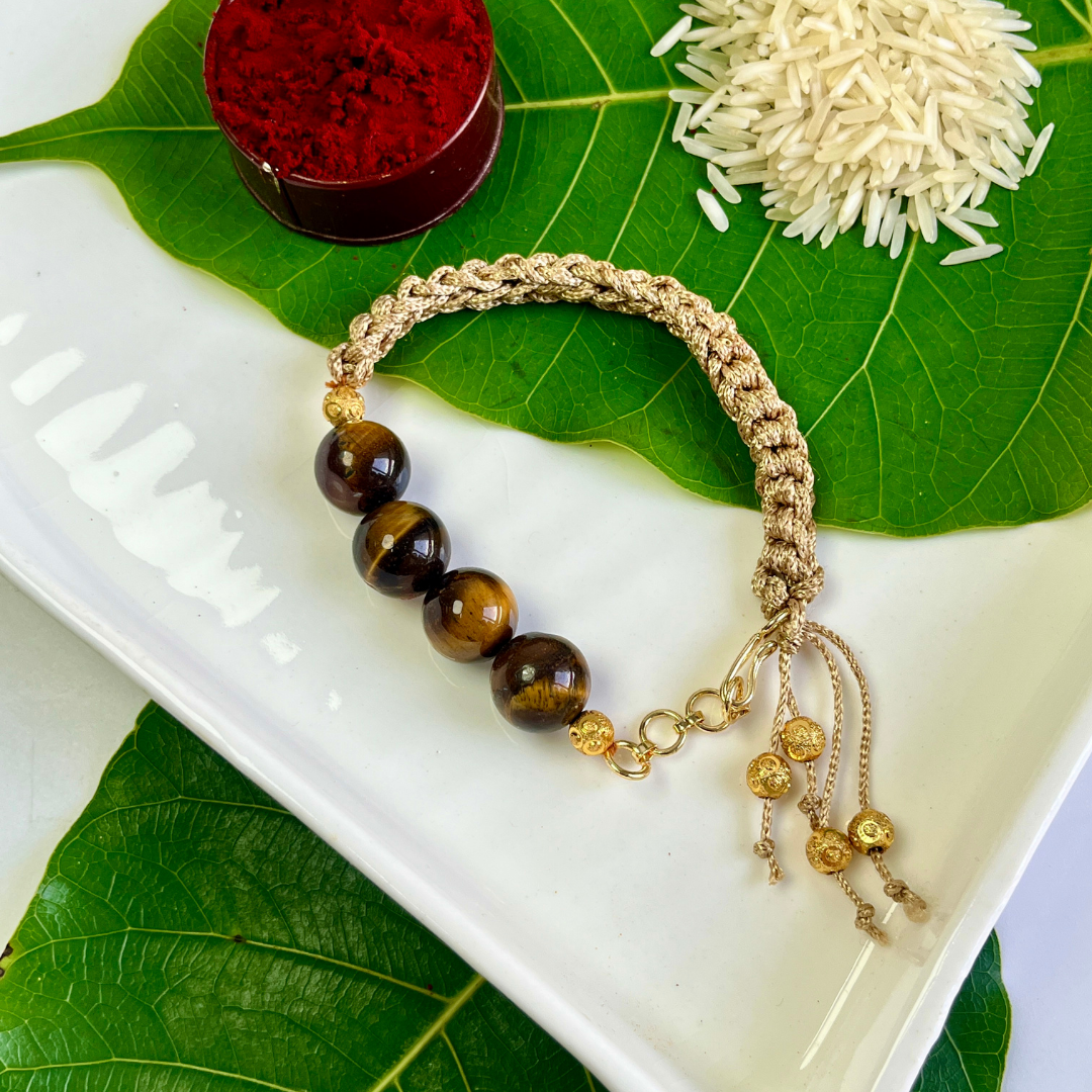 This Raksha Bandhan, celebrate the sacred bond with a rakhi that radiates strength and focus. Made with 12mm natural Tiger Eye beads, this rakhi is more than festive—it's a powerful talisman of protection and confidence for your brother.
