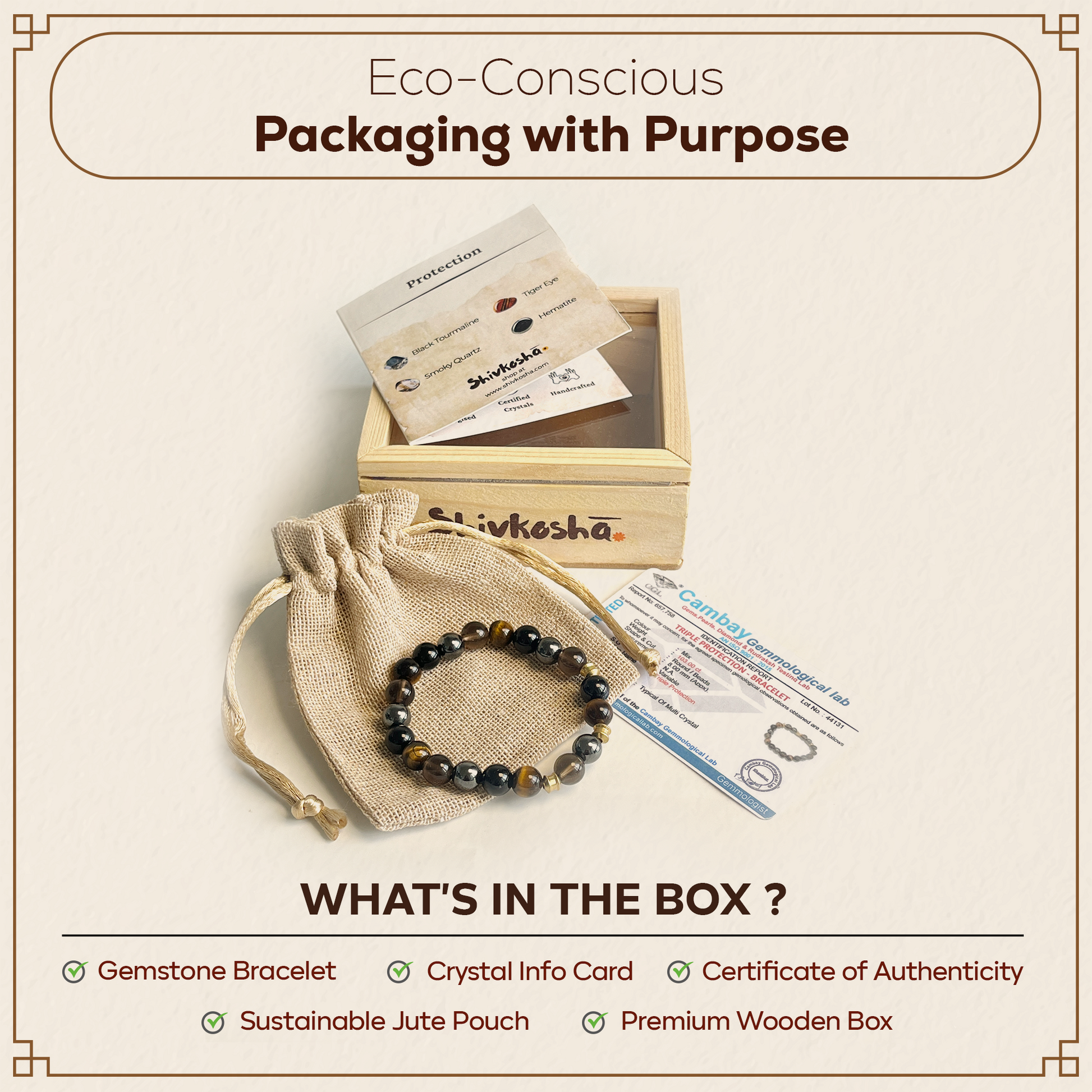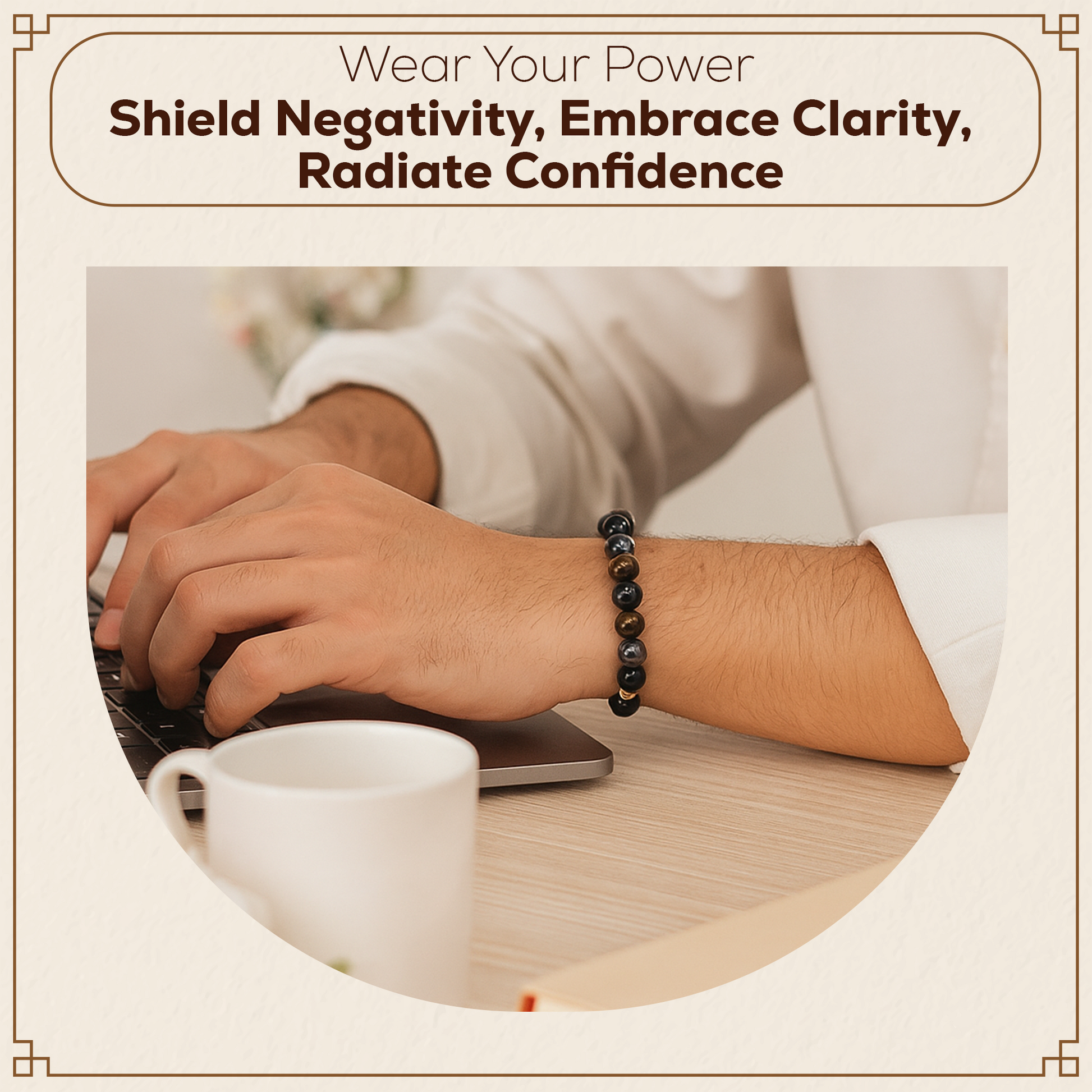 This Protection Gemstone Bracelet, crafted with Tiger Eye, Smoky Quartz, Black Tourmaline, and Hematite, creates a powerful shield against negativity, promotes emotional strength, and enhances stability. It helps protect against negative energies, stress, and emotional turmoil, ensuring inner balance and confidence.