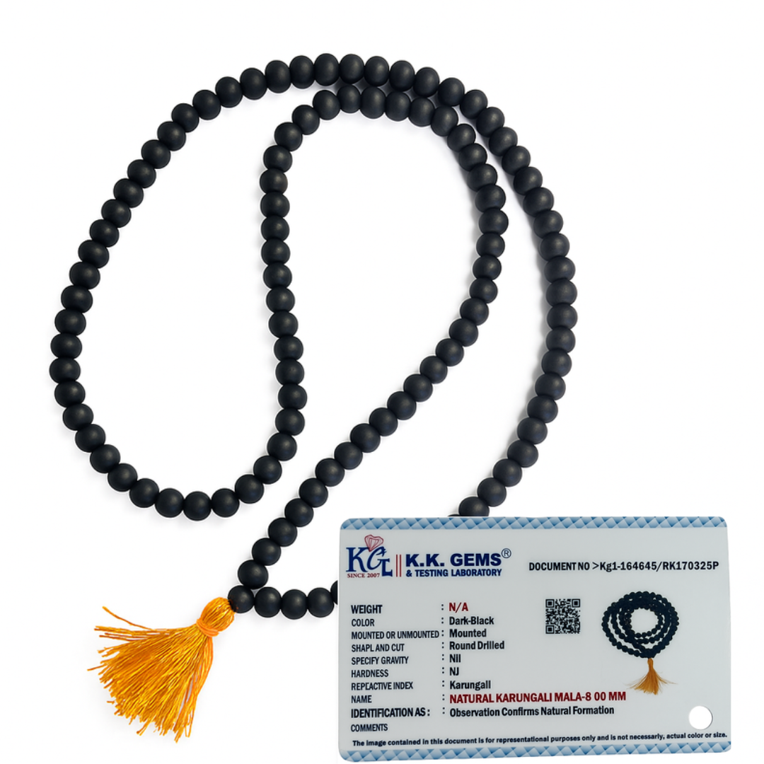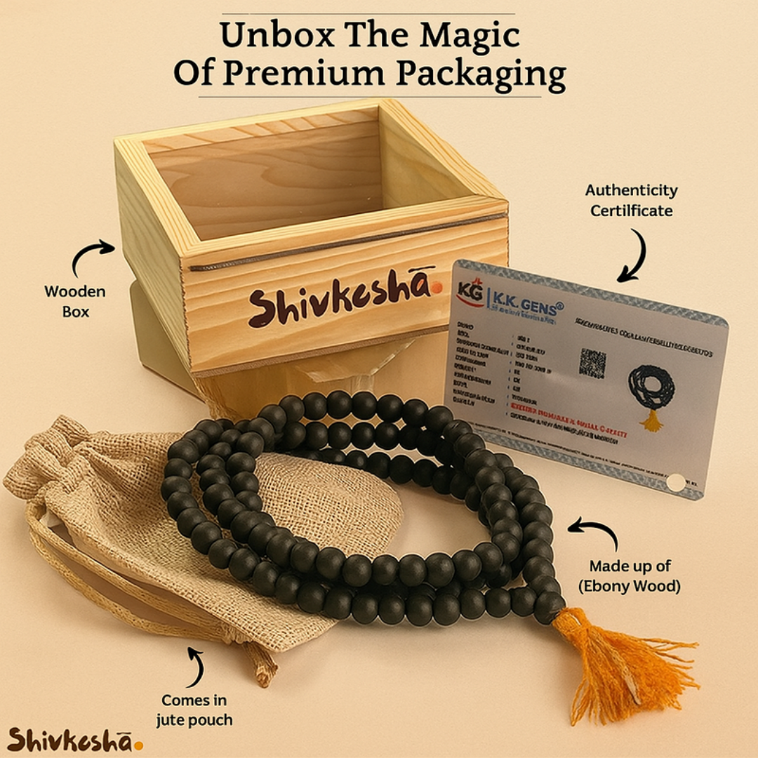 The Natural Karungali Jaap Mala, crafted from pure Ebony Wood beads (Karungali), is a sacred spiritual accessory widely used in mantra chanting, meditation, and pooja rituals. Known for its deep black color and strong energy, Karungali is believed to absorb negative vibrations, provide spiritual protection, and enhance concentration during prayers.