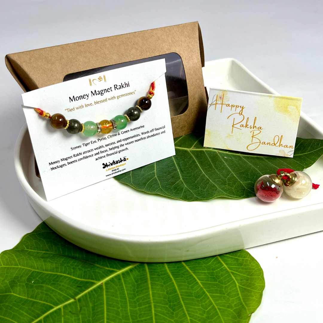 This Raksha Bandhan, tie more than a rakhi—tie a vibration of abundance and prosperity. Our Money Magnet Rakhi is crafted with four powerful wealth-attracting crystals: Citrine, Tiger Eye, Green Aventurine, and Pyrite. Together, they form an energetic grid designed to bring success, confidence, and financial flow to your brother’s life.