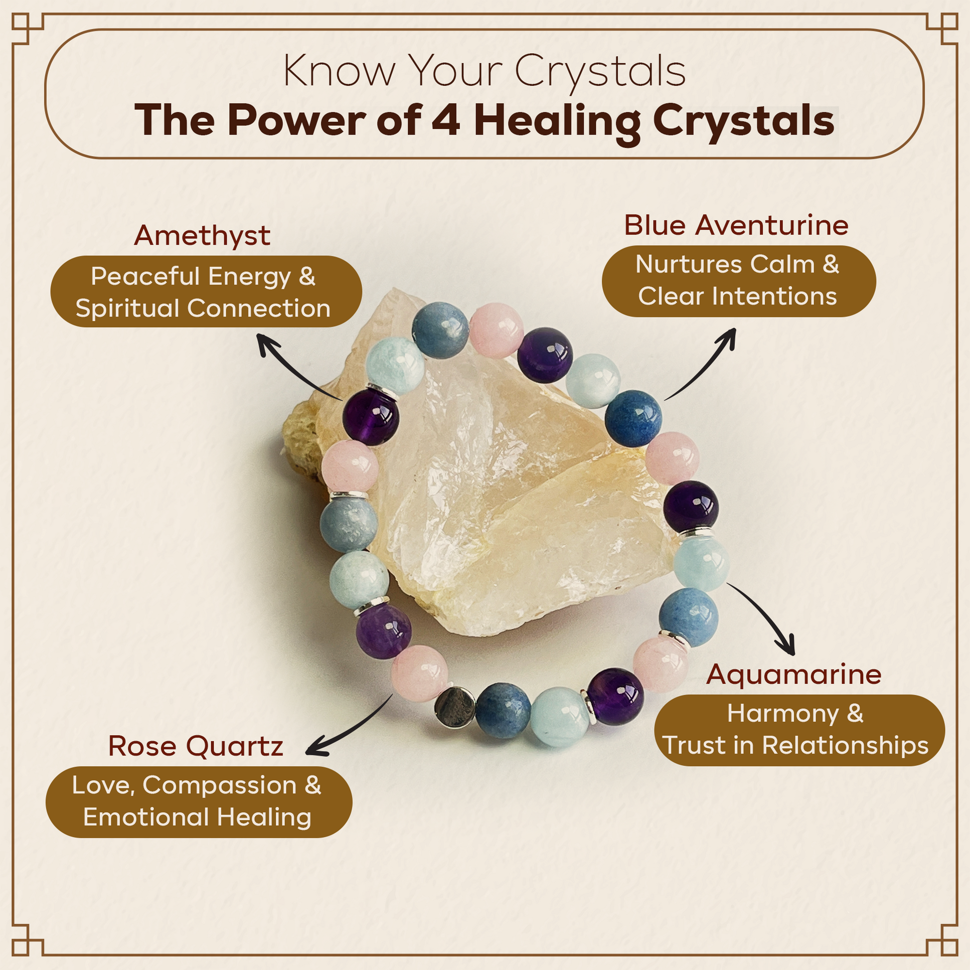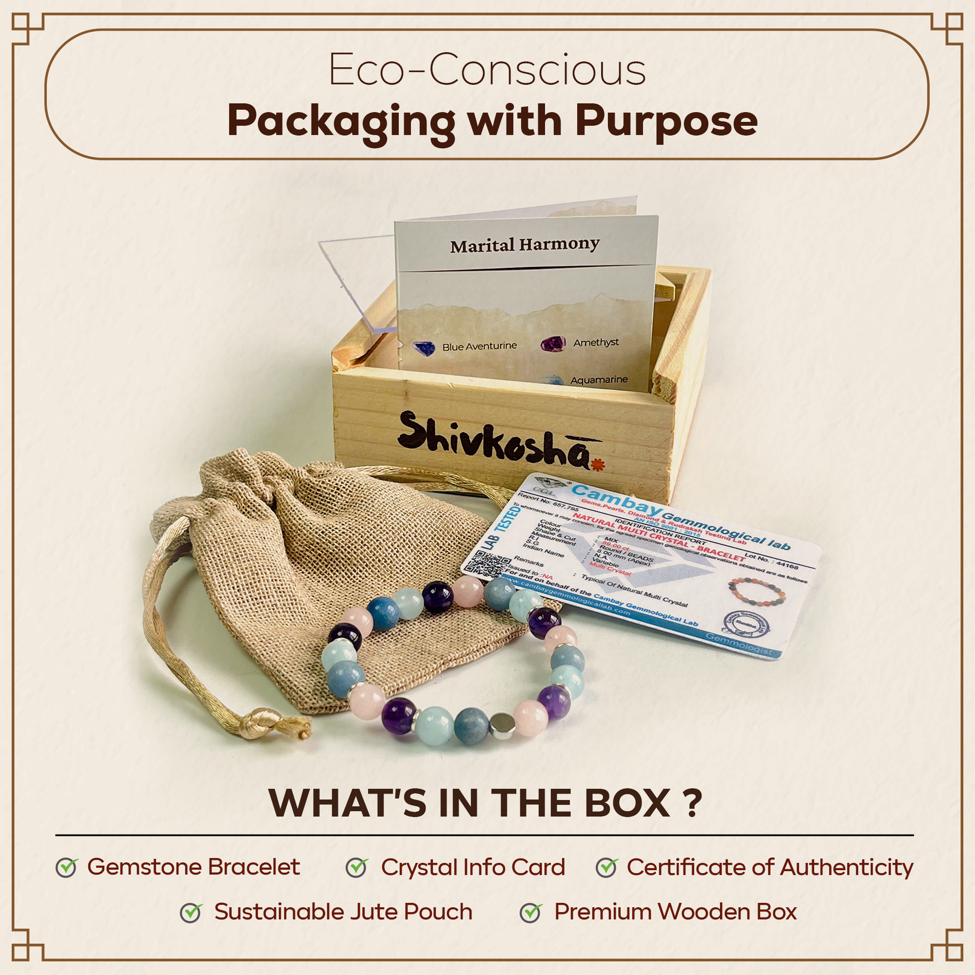 This Marital Harmony Gemstone Bracelet, crafted with Aquamarine, Blue Aventurine, Amethyst, and Rose Quartz, nurtures love, deepens emotional bonds, and enhances harmony in relationships. It promotes trust, understanding, and open communication, helping couples navigate challenges with patience and compassion. This bracelet fosters emotional balance, strengthens spiritual connections, and encourages lasting love, ensuring a relationship filled with peace, joy, and mutual respect.